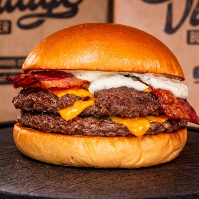 pão brioche, 2x carne smash 100g cada, 2x queijo cheddar, 2x bacon crocante e maionese vintage.